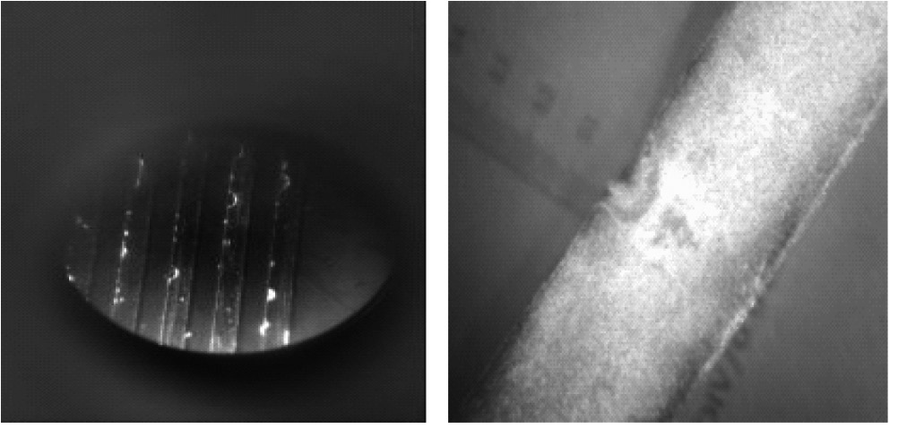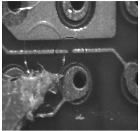 圖形轉移對位、曝光過程,對位臺及曝光機內存在干膜殘渣,若不及時清理,粘附板面后會造成鍍銅凹坑,嚴重可致斷線(如圖5)。要解決此問題,需對曝光機進行定時清理,工作前需使用靜電除塵輥粘附對位臺及曝光機、曝光夾上多余雜物,使用擦拭紙蘸無水乙醇清潔對位臺及曝光夾??筛鶕嶋H情況,要求定時清潔曝光玻璃、麥拉膜上下面、對位臺面及使用底片等,一般建議最少每曝光5次,進行一次清潔。