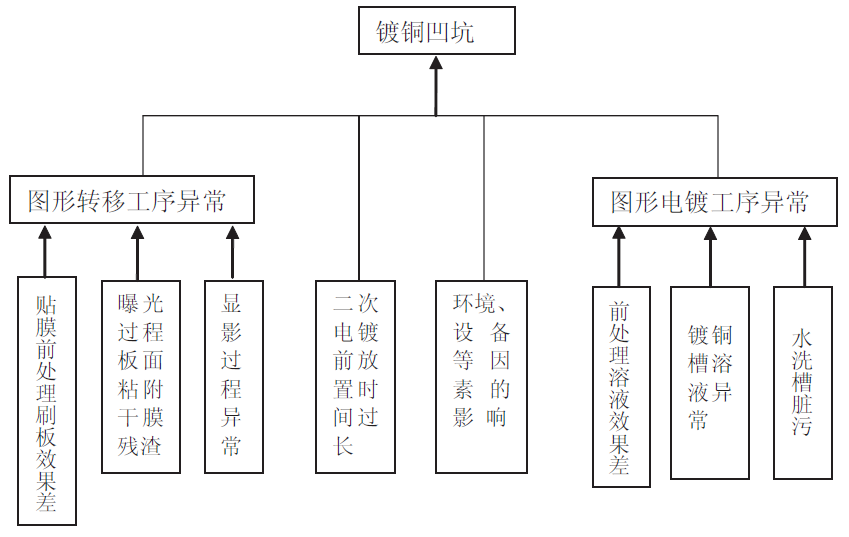 本文從圖形轉移、圖形電鍍過程分析了鍍銅凹坑產生的機理及原因,并提出了改善措施,較大幅度降低了鍍銅凹坑的報廢率,通過此次分析可看出做好溶液的維護保養、各槽體定期清洗和各細節嚴格管控,對于鍍銅質量有較好的改善。