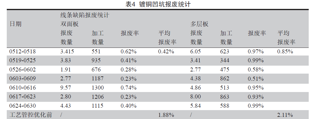 經過對圖形轉移及圖形電鍍工序進行工藝參數的優化及生產過程嚴格管控后,統計現階段鍍銅凹坑報廢率情況(見表4),其中雙面板的報廢率由之前的1.88%降至0.42%,多層板的報廢率由2.11%降至0.85%。鍍銅凹坑的報廢數量減少3倍以上.