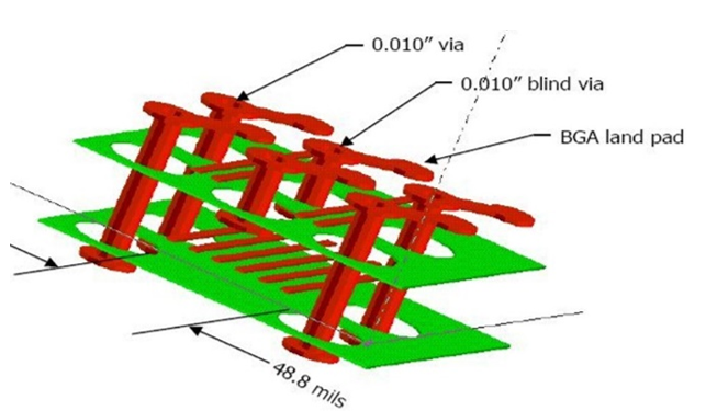 盲孔可用于在內(nèi)層形成林蔭大道,允許30%的路徑從BGA中流出