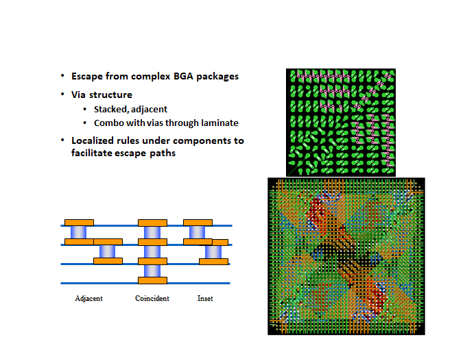 用于BGA扇出的微孔如圖9所示。微孔可放置在BGA焊盤外(插圖),部分放入/放出焊盤(部分vip)或完全放入'焊盤'(vip) - 見圖10 ..如果放置焊盤中的通孔,則通孔應(yīng)始終為“偏心”,而不是放置在焊盤的直接中心。這是為了最大限度地減少焊接過程中任何被困空氣的“空洞”。如果將通孔放置在BGA焊盤的中心,并且沒有填充,則當(dāng)焊膏施加在焊盤上,并且BGA放置在焊盤上時,在回流期間,當(dāng)焊料熔化時,BGA球落下并捕獲可能存在的任何空氣,就像“瓶中的軟木塞”。通過將通孔“偏離中心”,當(dāng)焊料熔化并流入微孔時,空氣有機會逸出。