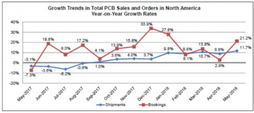 2018年5月份,PCB訂單量,與去年同期相比,增加了21.2%;年初至今的訂單量高于去年14.4%;與上個月相比,5月份的訂單量增長了6.3%。